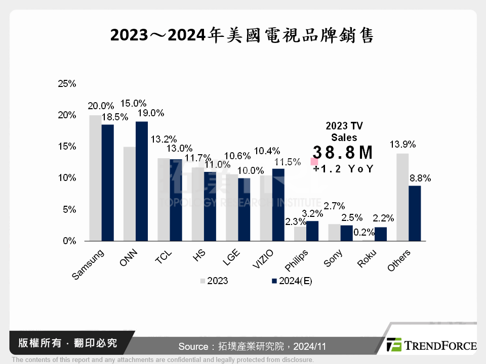 市場上,電視的需求正向高階和大尺寸機型轉移,中國和北美地區電視需求尺寸往75吋、85吋、98和100吋增長,帶動2024年平均尺寸年增1.5吋,達55.6吋,同時2024年第三、四季出貨量較預期分別提升1%、2.1%,推升2024年電視品牌出貨量達1億9,662萬台,年增0.6%,終結連5年衰退,但由於中國節能補貼政策期限到2024年底,不排除中國2025年電視需求提前透支,恐讓2025年整體出貨年增率再次由正轉負,年減0.3%,達1億9,600萬台。