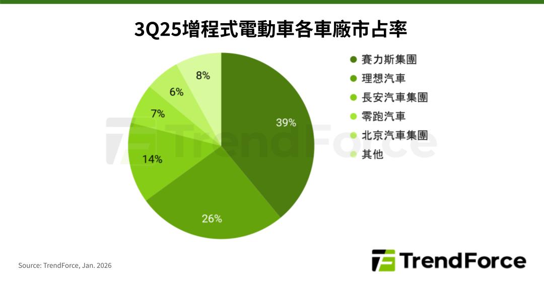 REEV於全球新車市場的滲透率已從原本不到3%,至2025年第三季穩定維持在4%左右。中國車廠憑藉相對較低車價、電池成本優勢主導市場,指標業者如賽力斯集團、理想汽車、長安汽車集團。不過,BMW、Volkswagen、Volvo、Stellantis等歐洲車廠也已陸續宣布、或傳出有意於2026年導入REEV車型,作為純電市場成熟前的重要過渡。在內燃機技術領先的Toyota,以及Hyundai同樣有類似規畫。
